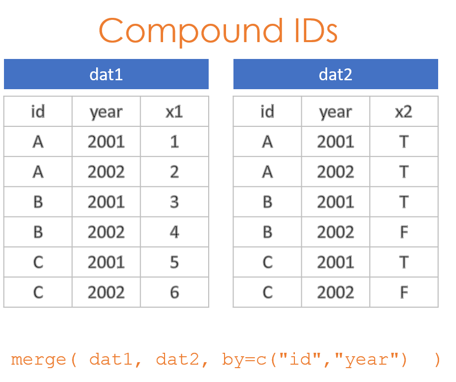 If we want to look at the relationship between employee sick days in a given year and their performance, we now might have multiple years of data for each employee. To merge these two datasets we need to use both ID and YEAR. This is an example of a compound ID - two or more variables are needed to create a unique key for the join.