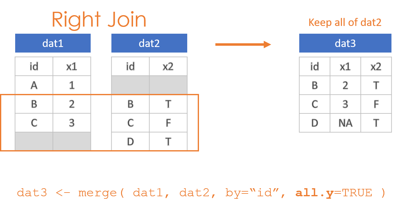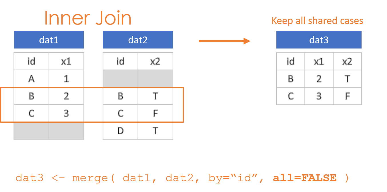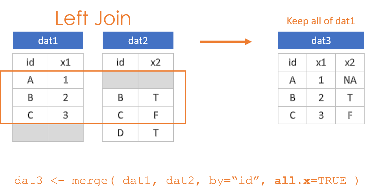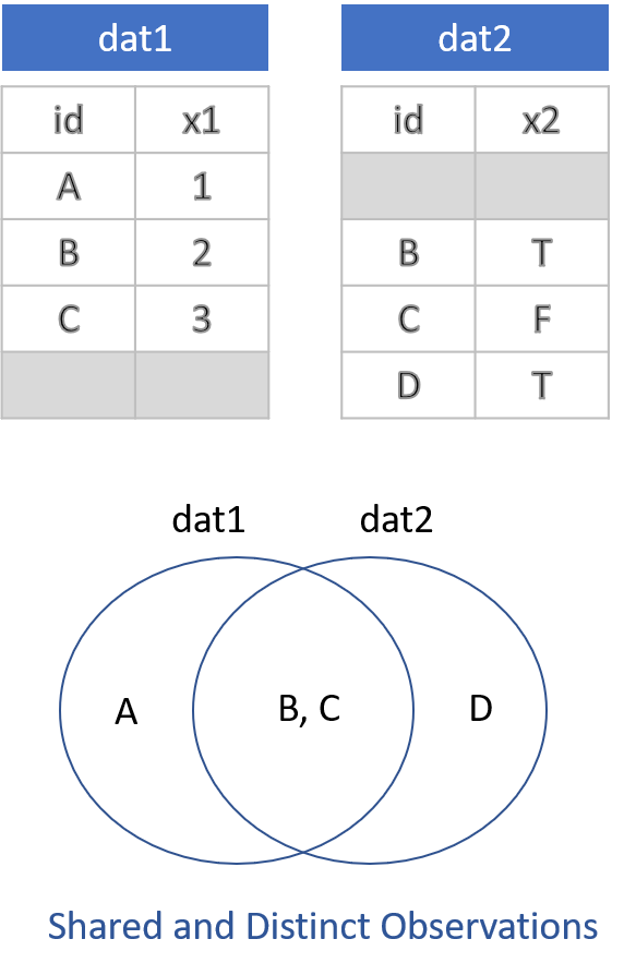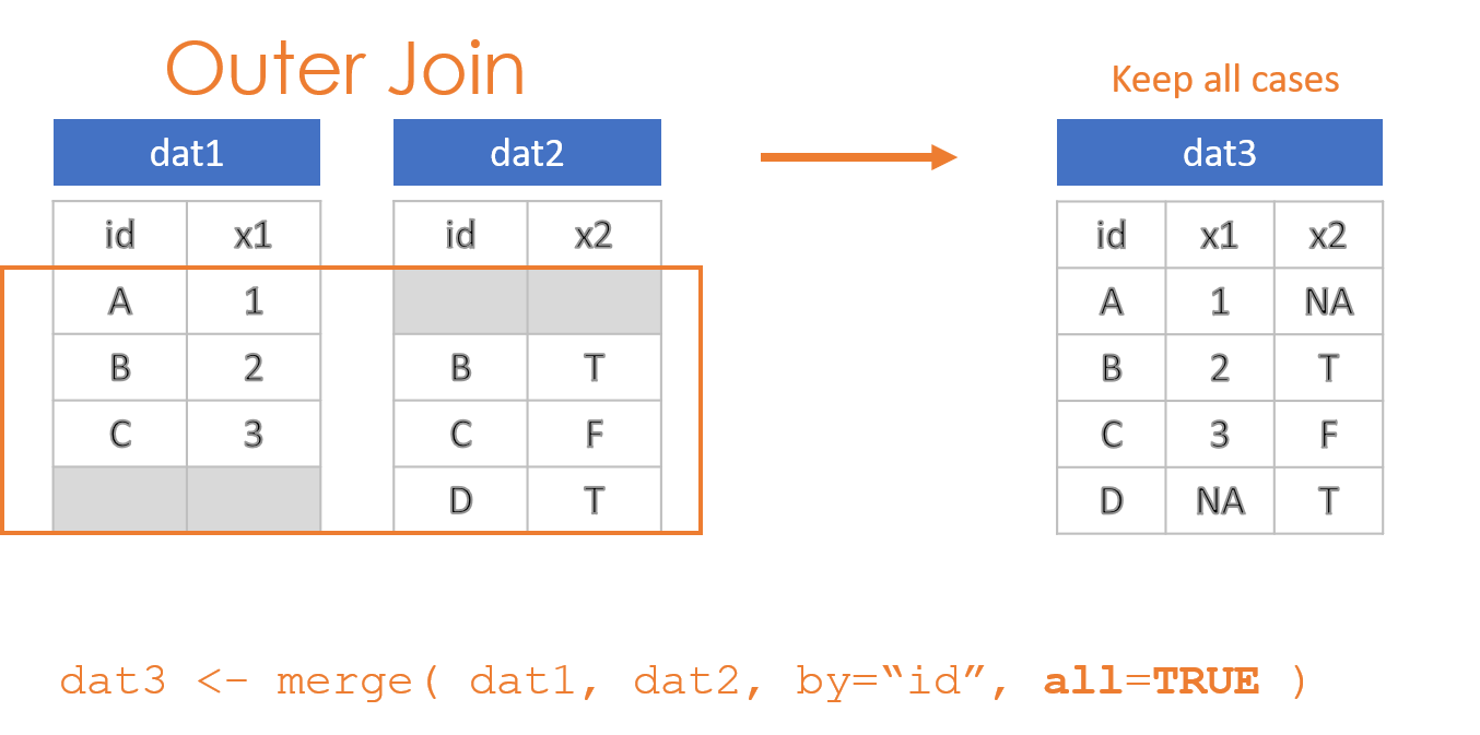 These options are specified through the all=, all.x=, and all.y= arguments in the merge() function, where the arguments all.x stands for observations in dat1, and all.y stands for observations in dat2 in this example.